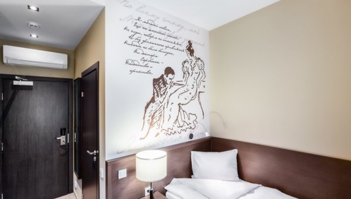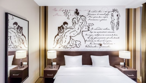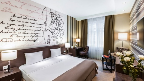 Все номера оформлены в оригинальном дизайнерском стиле по мотивам произведения “Евгений Онегин”. Комфорт и функциональность номеров позволят Вам в полной мере насладиться пребыванием в нашем отеле. Во всех номерах бесплатный высокоскоростной Wi-Fi Интернет, спутниковое ТВ, мини-бар, сейф, телефон, кондиционер, кровати с ортопедическими матрасами и постельным бельем из хлопка высокого качества, тапочки, ванные принадлежности, фен.